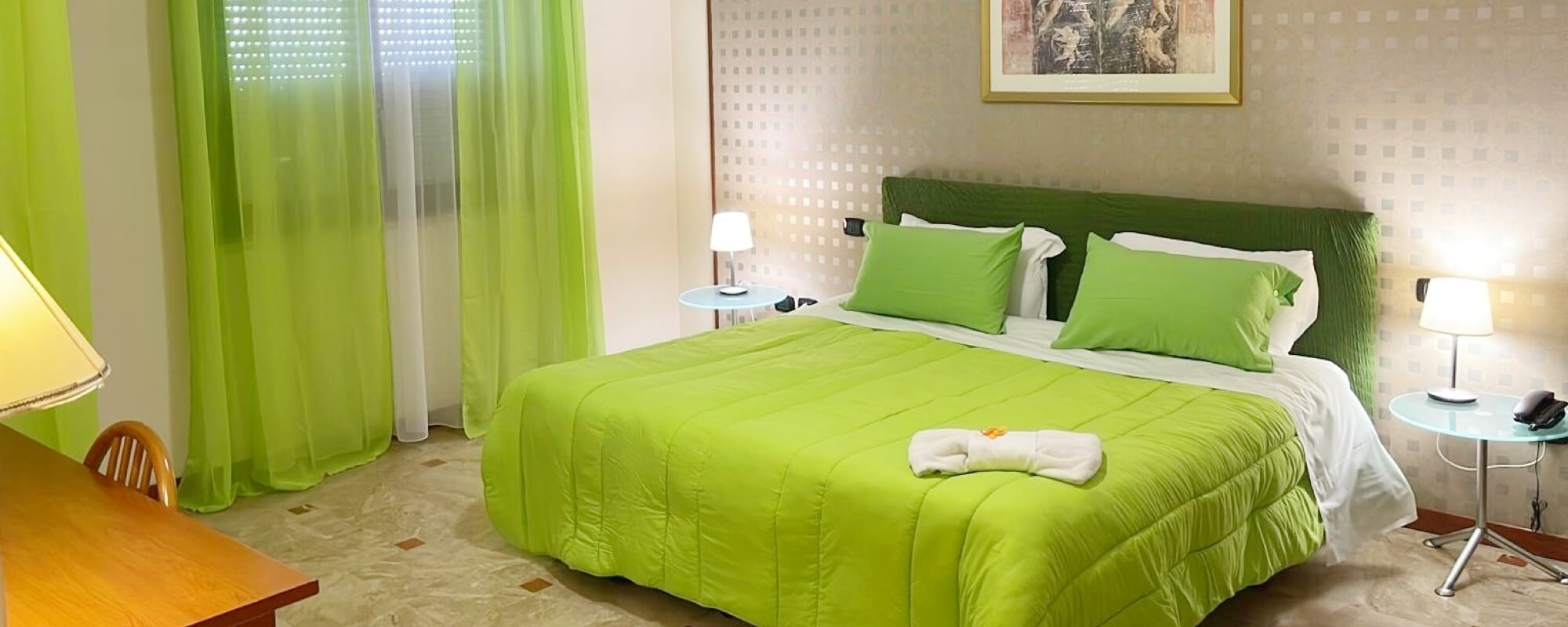 Questa camera di 32 mq circa, è l'ideale per chi desidera un soggiorno in spazi generosi, sia nella zona notte che nella zona bagno. Una sistemazione ottimale dopo una giornata di lavoro oppure trascorsa alla scoperta delle bellezze del territorio, una pausa rigenerante in un ambiente intimo e confortevole. Accogliente e funzionale, ha un letto matrimoniale extra king size, più grande delle misure standard (mis. 200x200).