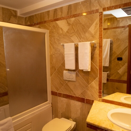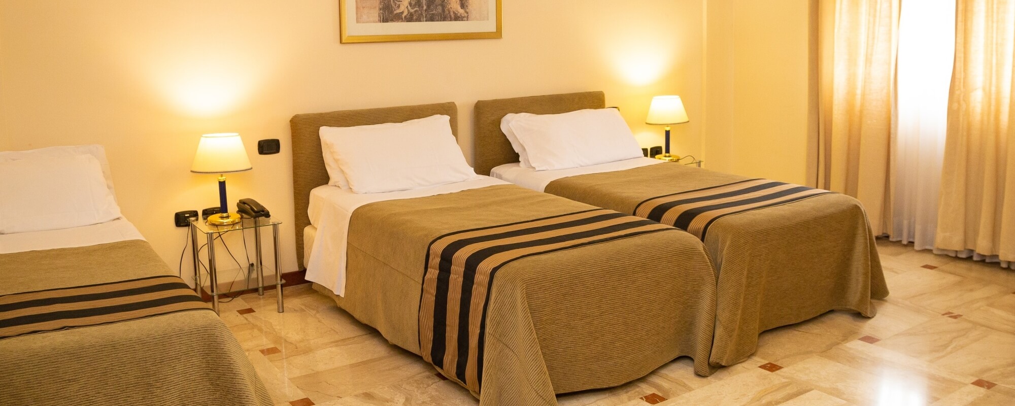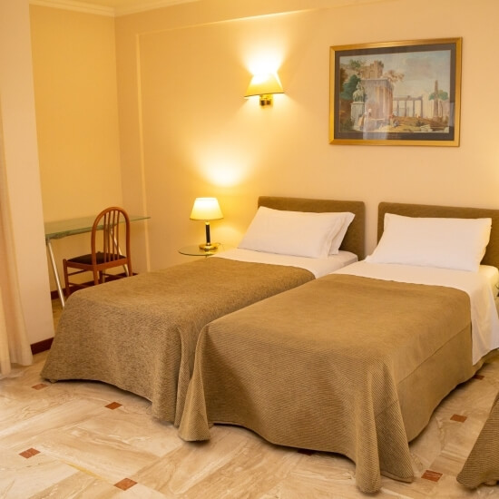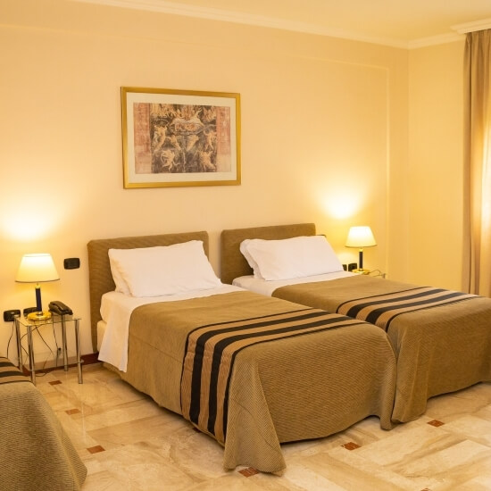Questa camera di 32 mq circa, è l'ideale per chi desidera un soggiorno in spazi generosi. Adatta ad ospitare comodamente una famiglia con quattro adulti o due adulti e 2 bambini, è dotata di 2 letti matrimoniali o di un letto matrimoniale e 2 letti singoli.